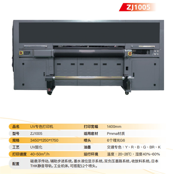 طابعة ZJ1005 UV Spot Color: صُممت هذه الطابعة خصيصًا لمواد PMMA، وتتميز بعرض طباعة يبلغ 1400 مم، وهي مزودة بستة رؤوس طباعة Ricoh G6 صناعية عالية الجودة. تصل سرعتها إلى 40-50 مترًا مربعًا في الساعة، وتتعامل بكفاءة عالية مع ألوان محددة (الأصفر، الأحمر، الأزرق، الأخضر، البني، الأسود) مع نظام نقل مغناطيسي لضمان تشغيل فائق الهدوء والدقة.
