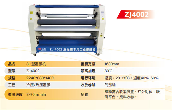 آلة تغليف الأفلام العاكسة المخصصة من النوع ZJ4002 3H (1630 مم): آلة صناعية تتميز بالتحكم في شد القابض المغناطيسي للمسحوق، والمحاذاة بالأشعة تحت الحمراء، ومنصة شفط فراغية، وسرعات دفع تصل إلى 3-70 متر/دقيقة.