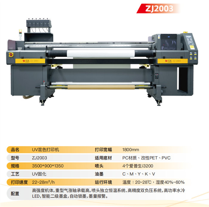 طابعة ZJ2003 UV متعددة الألوان: طابعة قوية ومتعددة الاستخدامات بعرض 1800 مم، مزودة بأربعة رؤوس طباعة Epson i3200. مثالية للطباعة على ركائز PC وPET المعدلة وPVC، وتوفر طباعة نابضة بالحياة بألوان C وM وY وK وV بسرعة 22-28 متر مربع/ساعة، مدعومة بنظام خرطوشة حبر ثانوي ذكي.