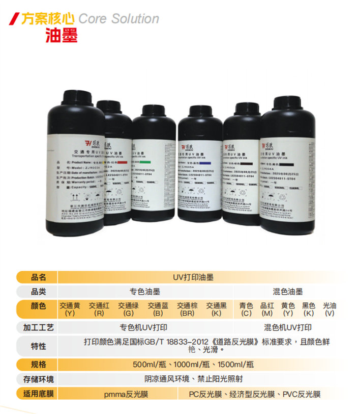 جودة الطابعة تعتمد على جودة حبرها. نقدم لكم بكل فخر أحبارنا الخاصة المقاومة للأشعة فوق البنفسجية والمصممة خصيصًا للاستخدام على الطرق. تتوفر هذه الأحبار بألوان محددة ومختلطة (500 مل، 1000 مل، 1500 مل)، وهي مصممة بدقة عالية لتلبية معايير GB/T 18833-2012 الخاصة بأفلام الطرق العاكسة. توفر هذه الأحبار وضوحًا استثنائيًا، ولمسات نهائية ناعمة، ومقاومة طويلة الأمد للعوامل الجوية على أفلام PMMA وPC وPVC العاكسة.